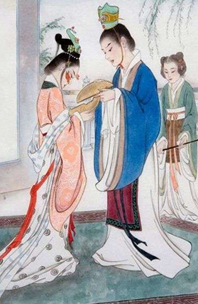 南朝陳國將亡時,駙馬徐德言預(yù)料妻子樂昌公主將會被人掠去,于是打破一面銅鏡,各拿一半,作為日后重見時的憑證,并約定每逢正月十五日,就在市集賣這半面鏡子,以探聽對方的消息。陳國亡后,樂昌公主為楊素所占,徐德言每逢正月十五日便到京城賣鏡,年復(fù)一年,終在某年見到一人叫賣破鏡,與所藏半鏡相合,于是題詩曰:“鏡與人俱去,鏡歸人未歸。無復(fù)嫦娥影,空留明月輝。”樂昌公主見到此詩,悲泣不食。楊素知道此事后,便讓公主與徐德言重新團(tuán)圓。
